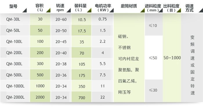 1. 型號說明:QM-(體積)-(A調(diào)速型,B普通型) 如:QM-50-A 為50L調(diào)速型輥筒球磨機;