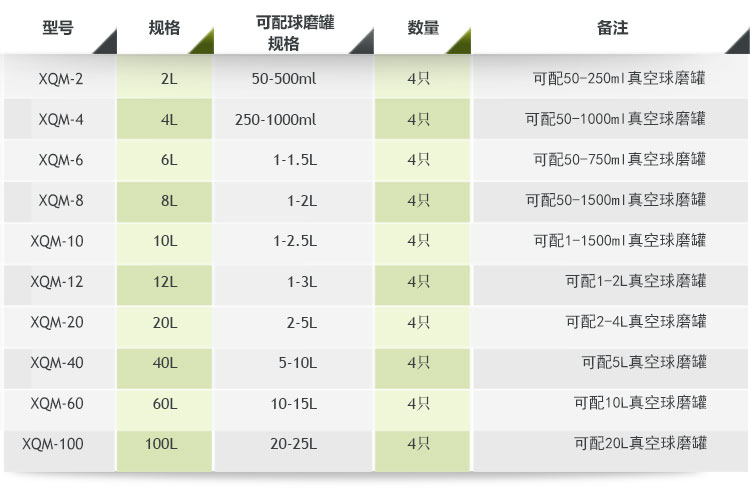 表一:低溫行星球磨機(jī)配罐參考
